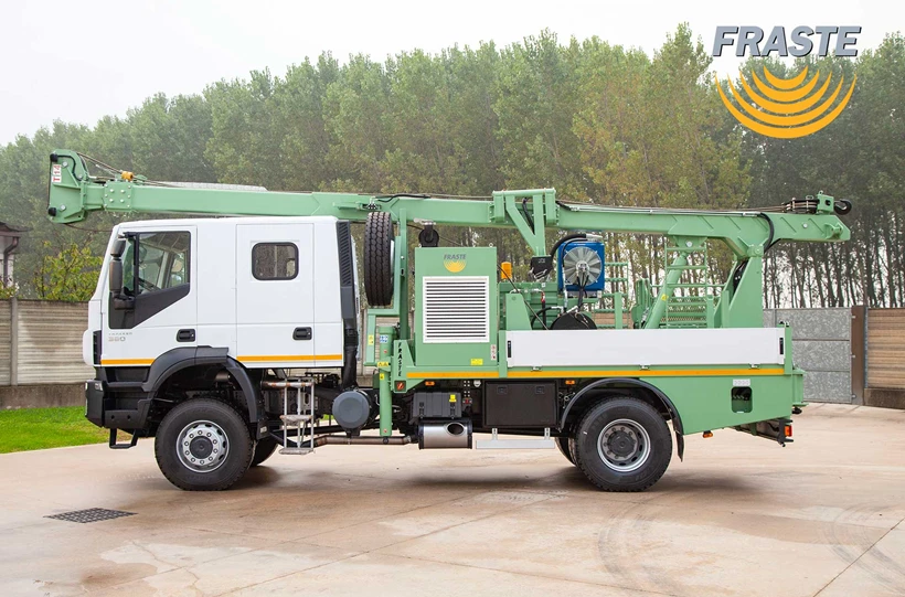 The FRASTE SR 14 is a convenient service and maintenance rig, equipped with a telescoping mast, hydraulic winch suitable for pipe lifting, and a submersible pump.