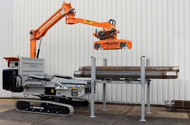 The ManipAll can lift tooling the drill rods up by magnet, once lifted off the rack, a hydraulic gripper locks closed to hold the rod.