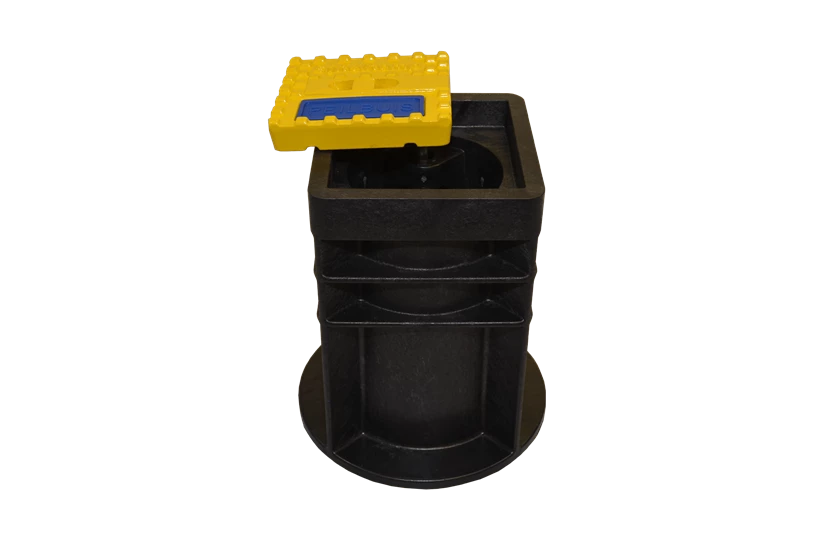 Sturdy plastic monitoring well cover with cast iron lid, for use in streets and roads.