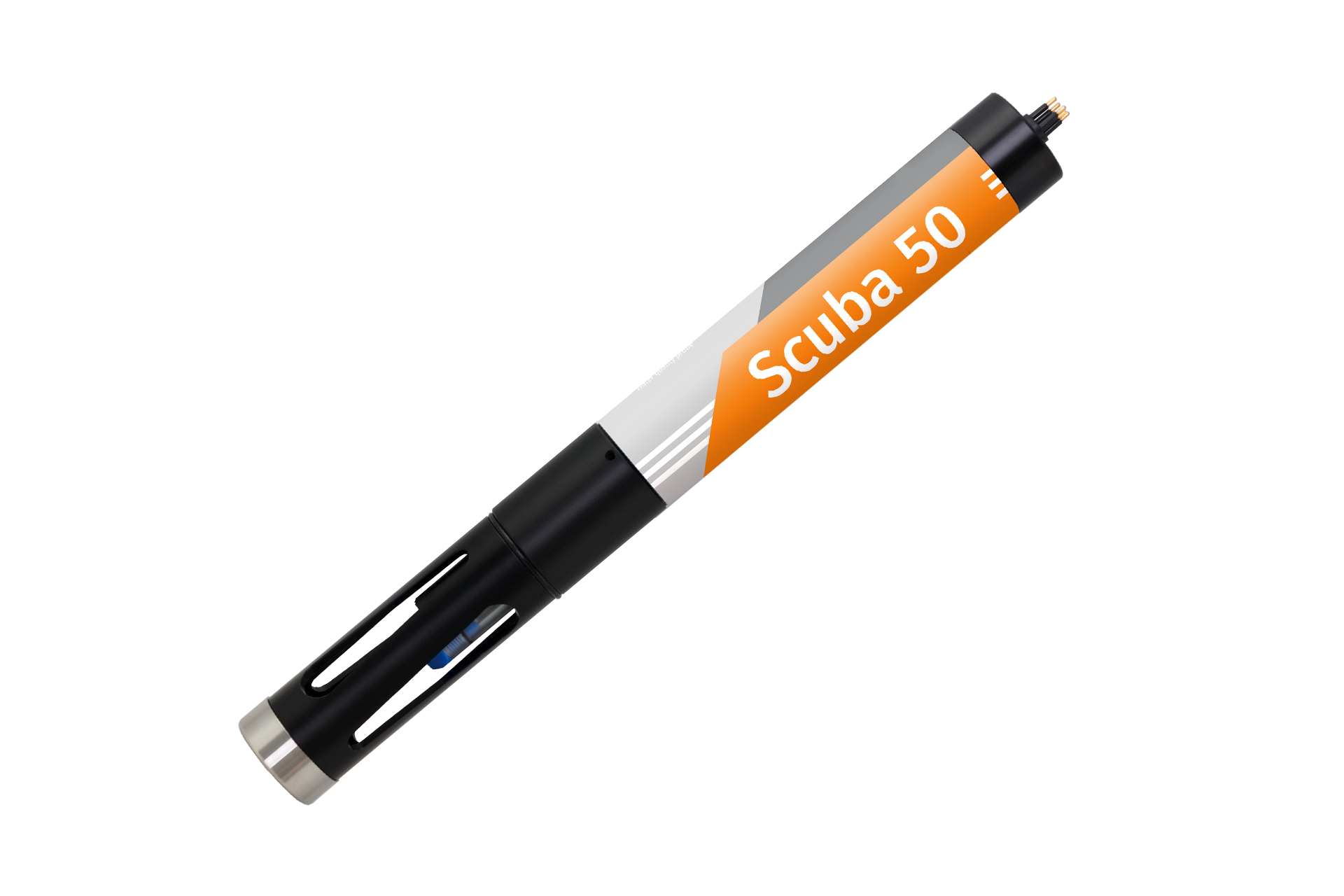 The Royal Eijkelkamp Scuba 50 measures 2 inches in diameter and is by default equipped with temperature, pH, electrical conductivity and dissolved oxygen sensors. Additional sensors are optional.