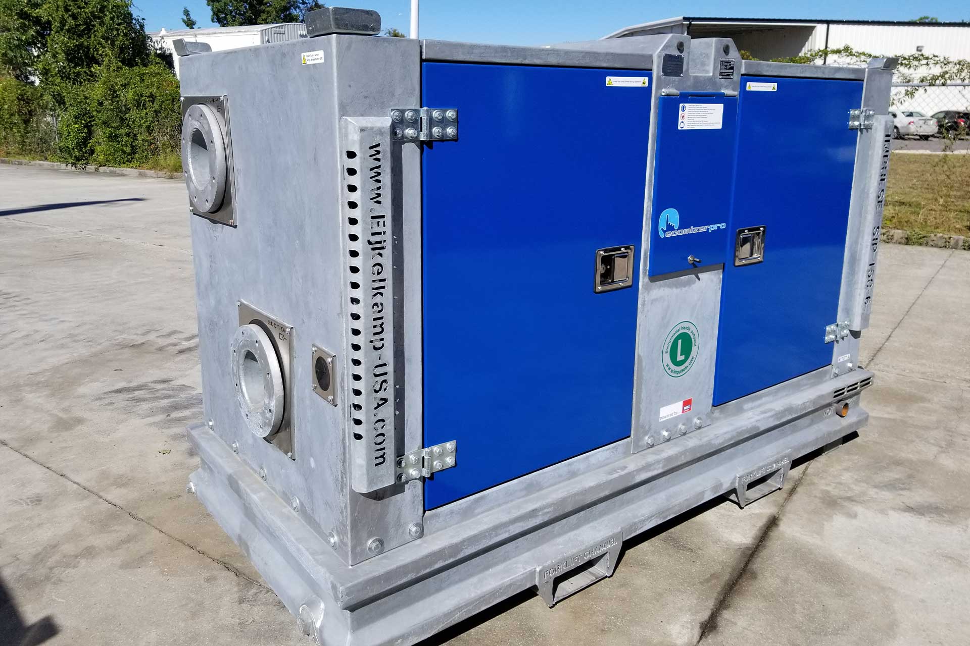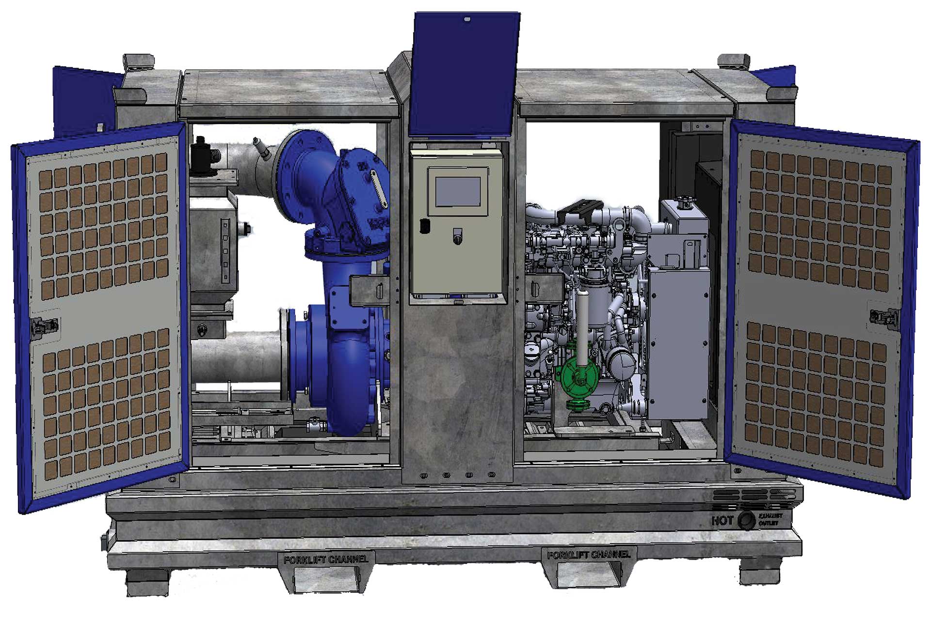 The design of this pump enables easy management, maintenance, and repairs. The pump’s Ecomizer Pro control system enables remote operation of the pump. Shim-free and “monobloc” design avoids any pump alignment requirements. All panels are removable convenient access points and adjustable wear plates. With useful forklift channels, this pump is also stackable up to 3 high.