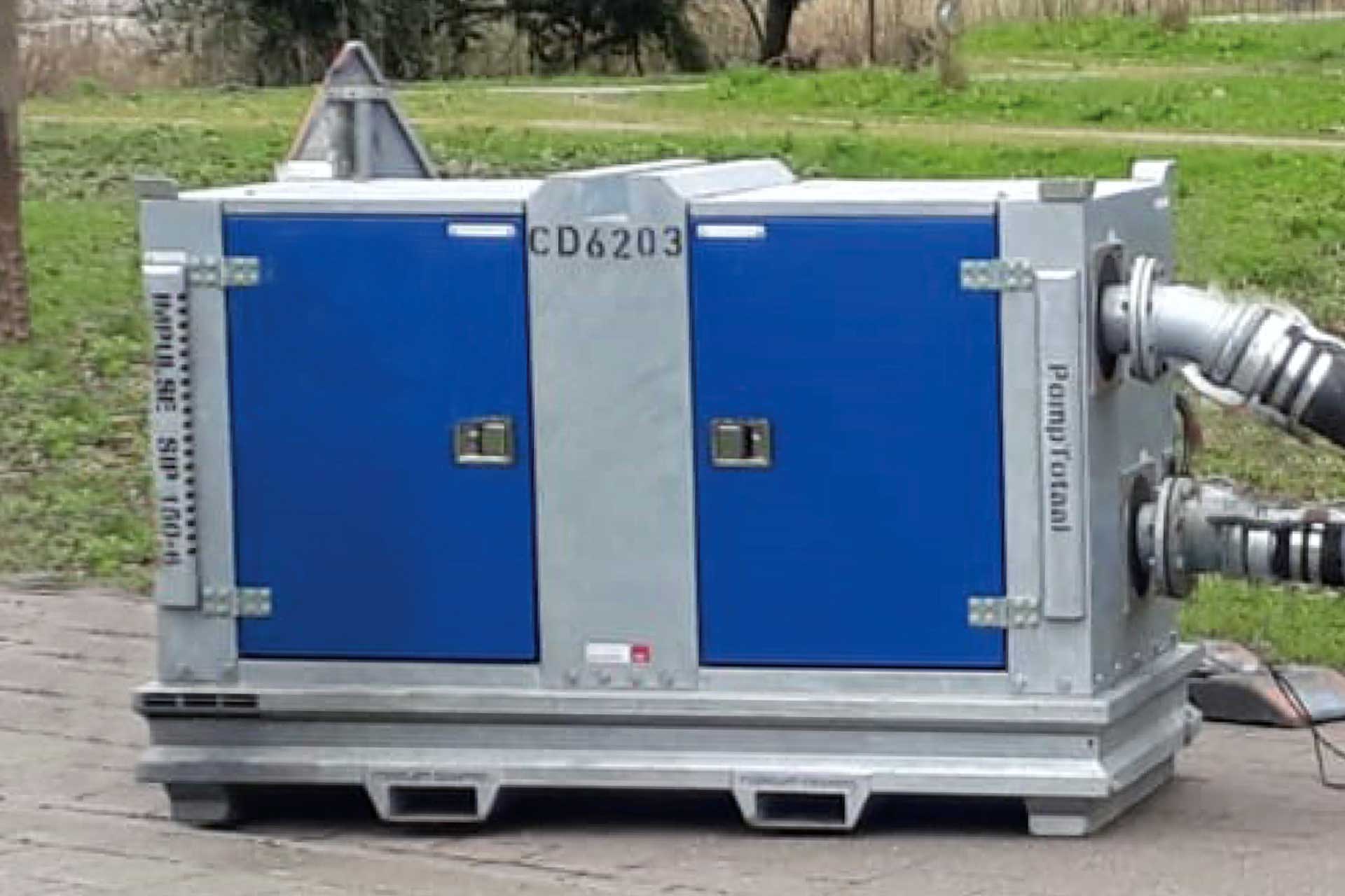 This pump is a diaphragm-assisted centrifugal screw impeller pump, using an efficient Hatz 3H50T water-cooled Tier 4 diesel engine. It is mounted on a sturdy galvanized chassis covered by a noise-reducing shell, with a lifting eye and forklift channels. Doors can be locked and all operating interfaces are installed securely inside the unit.