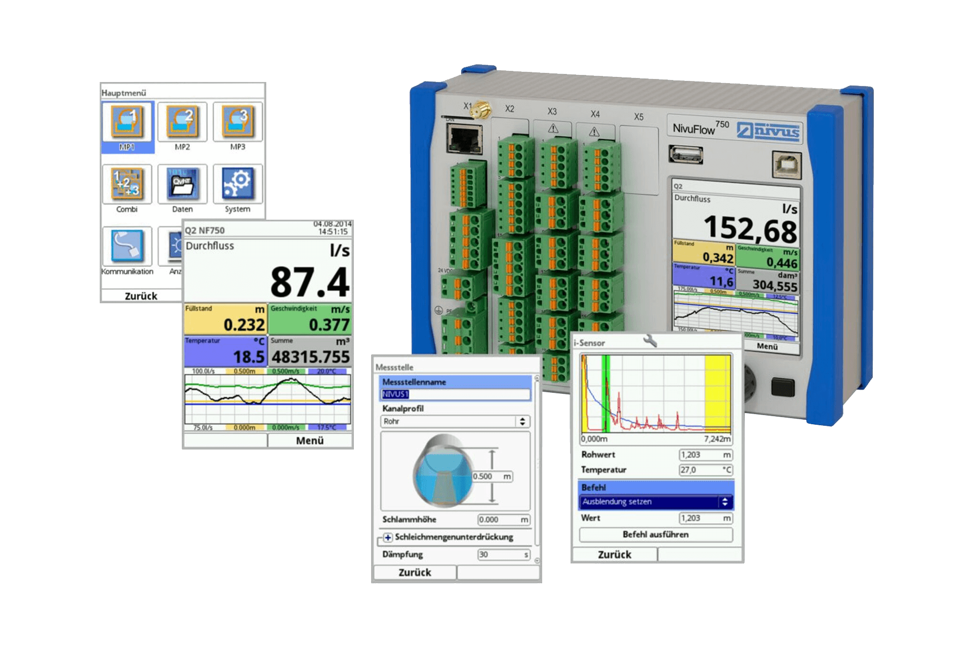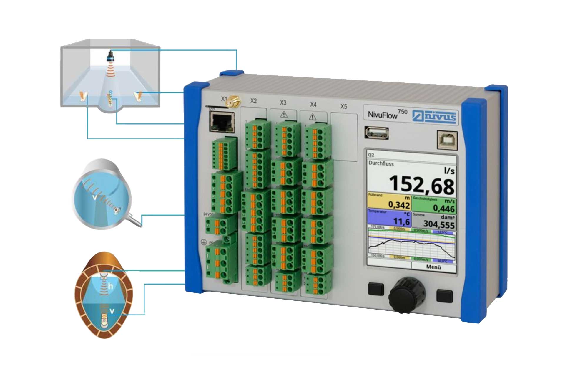 De NivuFlow 750 meet individuele stroomsnelheden op verschillende niveaus van het stromingsprofiel, op basis van de ultrasone kruiscorrelatiemethode. Zo kan een 3D-stromingsprofiel in real time worden berekend en op een reproduceerbare en verifieerbare manier weergegeven op het scherm van de debietmeter. Bij het berekenen van het debiet houdt het systeem rekening met beïnvloedende factoren, zoals de vorm van de goot, het afvoergedrag en de wandruwheid. De ingebouwde regelfunctie zorgt voor debietregeling in regenwaterbekkens of regenwateropvangbekkens, maar ook in riolen met opslagcapaciteit en overstorten.