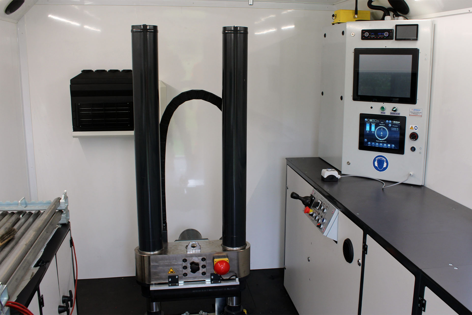 The fully ballasted rig is able to achieve high production rates thanks to its quick positioning between locations, efficient automatic levelling system and lack of a need to install any anchors. When in position, your operators work from a fully contained and well equipped cabin with an integrated 200 kN pusher, with hydraulic push/pull and catching clamps.
