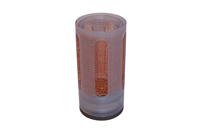 The copper gauze slowly dissolves in the water, bathing the sensors in copper ions. This helps prevent fouling.